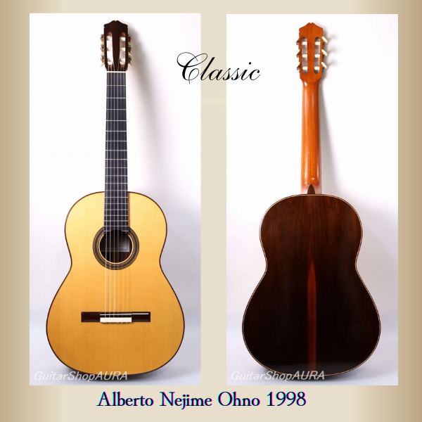 アルベルト・ネジメ・オーノ Alberto Nejime Ohno(禰寝孝次郎)1952年生まれ。1979年にスペインに留学し、グラナダの名工アントニオ・マリンにギター製作を師事。2年に及ぶその期間中彼はほとんど家族の一員のようにして製作を共にし、単に技法の習得だけではなくその土地の文化風土や人間性をも吸収しながらスペインの伝統工法を学んでいます。帰国後に発表した彼の楽器は、感性的な領域にまで深くスペインのニュアンスを染み込ませた逸品として、国内では初めての本格的なスパニッシュギターと評価されるようになります。1988年にはチェコスロバキア・クツナホラ国際ギター製作コンクールにてグランプリを受賞し、国際的にもその実力は高く評価されるようになります。他の追従を許さぬ美しく気品のある外観の仕上がりと、重厚かつ濃密で艶やかな音色と十分な遠達性を備えた作風は近年益々円熟味を加え、師のアントニオ・マリン同様にマニア垂涎の楽器として、現在その評価は不動のものとなっています。また製作と同時に後進の指導や執筆活動にも尽力し、 第一回アマチュアギター製作コンテスト審査員、スペインにて第7回コリアギター講習会参加、ギター製作家in八郷審査員をつとめるなどのほか、雑誌<現代ギター>に「君もギタービルダー」を連載、愛好家からの大きな反響を得て「スペイン式クラシックギター製作法」として書籍化されています。2020年にはフランスの出版社Camino Verde刊 Orfeo Magazine No.15で彼のインタビューと楽器が紹介されました。