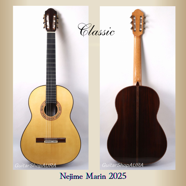 禰寝碧海 Nejime Marin 製作、オリジナルモデル ’Iglesia de Santa Maria de la Alhambra’2025年新作です。碧海氏は近年グラナダの街に因んだタイトルが付されたモデルを続けて発表しており、それはもちろん氏がアントニオ・マリンの工房で学んだ日々の極めてリアルな肌感覚や印象的風景に基づくもので、タイトルとその楽器との関係は絵画におけるそれさえも思わせるような、ある意味文学的なイマジネーションを喚起するものとなっています。さらにこれらのタイトルは決して楽器のイメージを安直に規定するような恣意的なものでは決してなく、それぞれの音響コンセプトとの連関もあるところはいかにも碧海氏らしい矜持の深さを感じさせます。