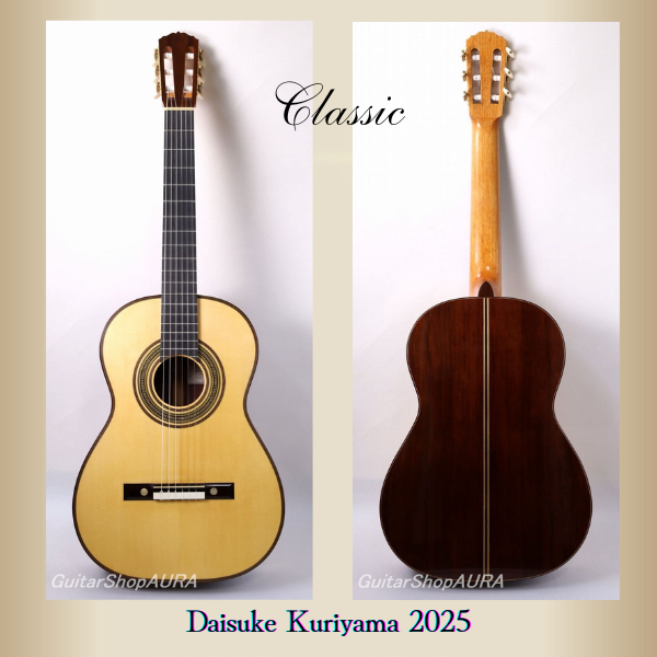 本作はいわゆる1937年製セゴビアモデルではなく、それに先立つ1929年に製作されたハウザー1世のギターに準拠して作られたもの。1924年にアンドレス・セゴビアによるスパニッシュギターの洗礼を受け、彼の所有するマヌエル・ラミレスのギター(実際に製作したのはサントス・エルナンデス)をサンプルに、ハウザーはスパニッシュスタイルによるドイツギターの創案に着手します。そして1937年に「セゴビアモデル」にてその絶嶺に達しますが、そこに至るまでには試作品の域をはるかに超えた名品を多く残しています。栗山氏がここで取り上げた1929年モデルは、あの印象深い1928年製リョベートモデルの後、そしてプレセゴビアモデルともいえる素晴らしい1931年製モデルとの間に位置する、ハウザー自身の探求と生産のバランスが強い緊張感を持っていた時期の名品。栗山氏は当モデルの製作に際し、オリジナルの実物を仔細に検分し、その形と音響とをしっかりと一つのアイデンティティの中に着地させています。