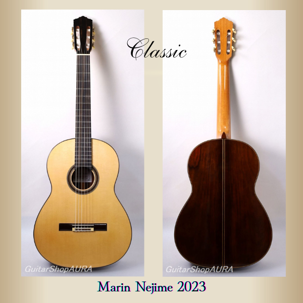禰寝碧海(ネジメ マリン)1986年生まれ。アルベルト・ネジメ・オーノの名称でギター製作を行っている禰寝孝次郎氏の息子。父、孝次郎氏の影響下のもと幼少より音楽と工作に興味を持ち、2009年自由学園を卒業後本格的にギター製作の道を進むことを決意します。何度かの訪西の後、2012年9月には長期間グラナダに滞在し、父の師匠でもある名工アントニオ・マリン・モンテロに師事。スペインの伝統工法に立脚した製作法で、そこに瑞々しく個性的な音響的特性を盛り込んだ彼の楽器は、実に新鮮な感覚にあふれたものとなっており、1本として同じものがありません。また造作と塗装の精度の高さと美しい仕上がりも父と師匠とに劣らぬ素晴らしいもので、外観のこの上ない凛とした気品に結実しています。