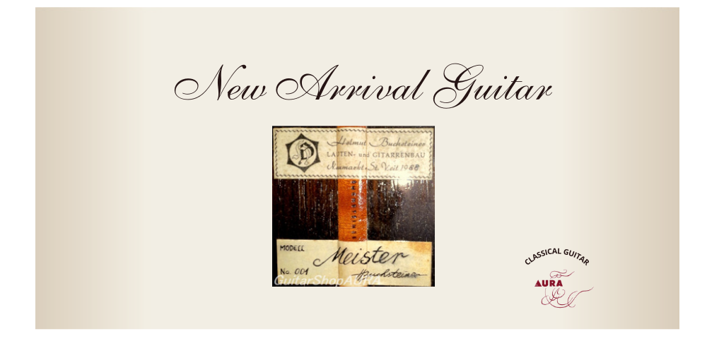 ヘルムート・ブッフシュタイナー 1988年製 モデル‘Meister‘ No.001 Usedの入荷です。このブランドで日本でもよく知られたB10 や 楕円形のサウンドホールが特徴的なワイスガーバーモデル等の通常ラインナップと別に限定的に出荷されたシリーズの第一作(No.001)となります。「マイスター」のモデル名が冠されていることからも(オリジナルラベルに加えてモデル名と製作番号を記したもう一枚のラベルが貼られています)、特にハイスペックなラインとして製作されたことがうかがえますが、木材の良質さや複雑な設計、全体的な仕上げなども彼らしい職人的精緻さと厳しさが行き渡っており、いつもながら納得させられる仕上がりとなっています。