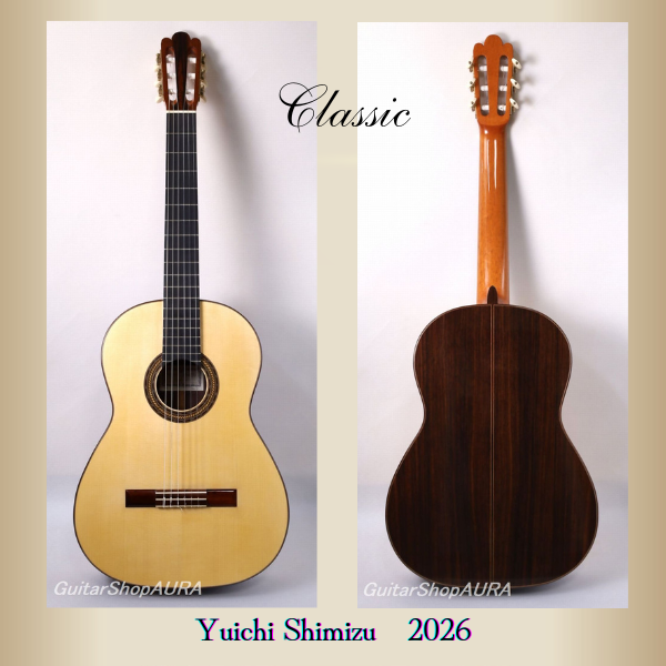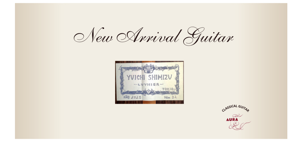 清水優一 製作 オリジナルモデル 2026年 No.32 新作です。ヘルマン・ハウザーやホセ・ルイス・ロマニリョスへのオマージュモデルにおいて素晴らしく充実した作を世に出している製作家の、注目すべきオリジナルモデル。清水氏は本作において、「どこにも属さない音」を着地点として設定したと言っており、つまり「スペイン的」であるとか「南米風」であるといった定型に帰属しない音響を目指したということになるのですが、清水氏はその自分なりの(まさに文字通りオリジナルな)音を、これまでどおり極めて伝統的な工法によって作り出すことに成功しています。