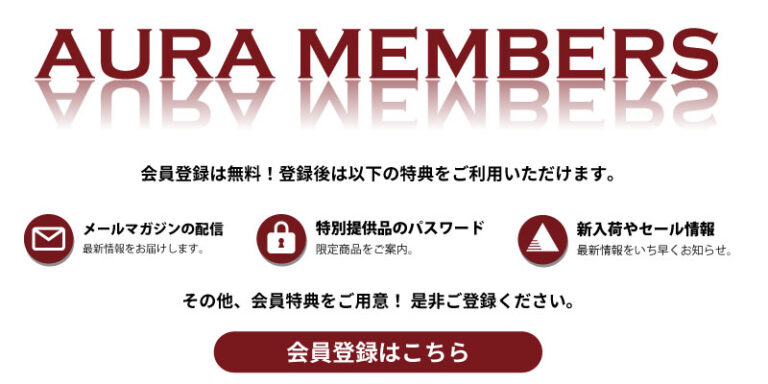 メールマガジン更新情報 メールマガジン 2026年4月中旬号【ギターショップアウラ】 2026年4月18日 admin 新作、オールド、中古ギターが今後も続々入荷予定!厳選された逸品をお見逃しなく アウラメンバーズ会員専用コンテンツこのページはアウラメンバーズ会員専用コンテンツです。続きを読むにはパスワードを入力してお進みください。アウラメンバーズは無料で会員登録いただくことができます。詳しくは「アウラメンバーズについて」をご覧ください。会員向けに発行された『今月のパスワード』を入力してください。パスワードは毎月発行されるメールマガジンにてご案内しています。パスワードは毎月変更されますので、最新のパスワードについてはメールマガジンにてご確認ください。今月のパスワード: