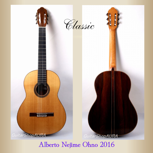 アルベルト・ネジメ・オーノ Alberto Nejime Ohno(禰寝孝次郎)1952年生まれ。1979年にスペインに留学し、グラナダの名工アントニオ・マリンにギター製作を師事。2年に及ぶその期間中彼はほとんど家族の一員のようにして製作を共にし、単に技法の習得だけではなくその土地の文化風土や人間性をも吸収しながらスペインの伝統工法を学んでいます。帰国後に発表した彼の楽器は、感性的な領域にまで深くスペインのニュアンスを染み込ませた逸品として、国内では初めての本格的なスパニッシュギターと評価されるようになります。1988年にはチェコスロバキア・クツナホラ国際ギター製作コンクールにてグランプリを受賞し、国際的にもその実力は高く評価されるようになります。他の追従を許さぬ美しく気品のある外観の仕上がりと、重厚かつ濃密で艶やかな音色と十分な遠達性を備えた作風は近年益々円熟味を加え、師のアントニオ・マリン同様にマニア垂涎の楽器として、現在その評価は不動のものとなっています。また製作と同時に後進の指導や執筆活動にも尽力し、 第一回アマチュアギター製作コンテスト審査員、スペインにて第7回コリアギター講習会参加、ギター製作家in八郷審査員をつとめるなどのほか、雑誌<現代ギター>に「君もギタービルダー」を連載、愛好家からの大きな反響を得て「スペイン式クラシックギター製作法」として書籍化されています。2020年にはフランスの出版社Camino Verde刊 Orfeo Magazine No.15で彼のインタビューと楽器が紹介されました。